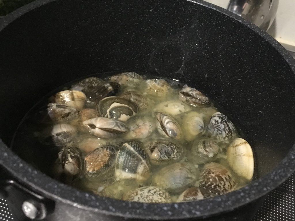 2分もゆでていれば、あさりはほとんど開きましたね。