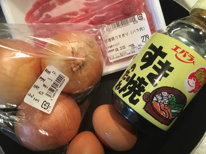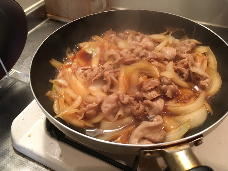2.切ったたまねぎと牛肉とすき焼きのたれを全てフライパンに放り込み、熱します。